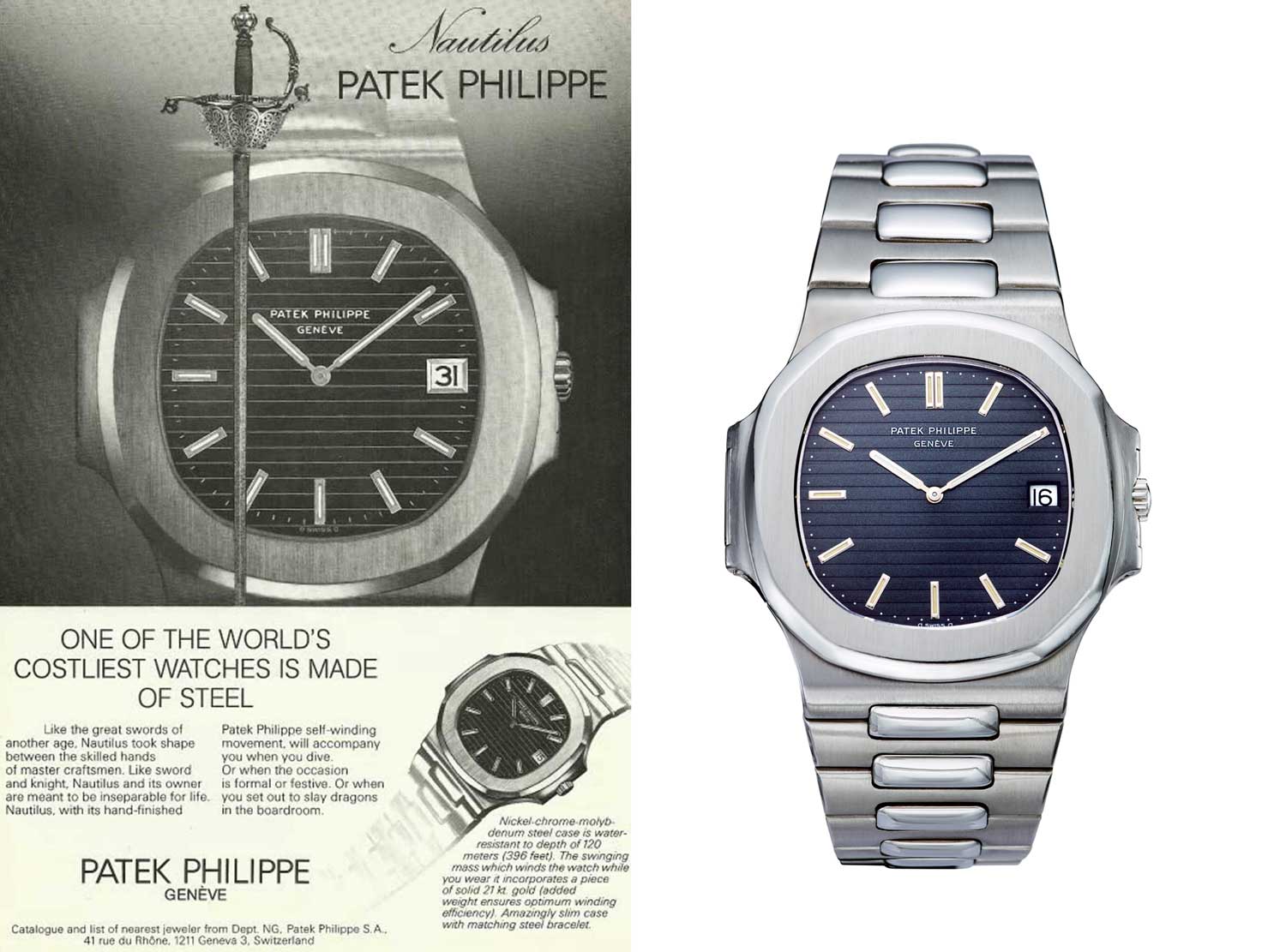 An old ad for Patek Philippe Nautilus ref. 3700 and the original Patek Philippe Nautilus ref. 3700/1A from 1976