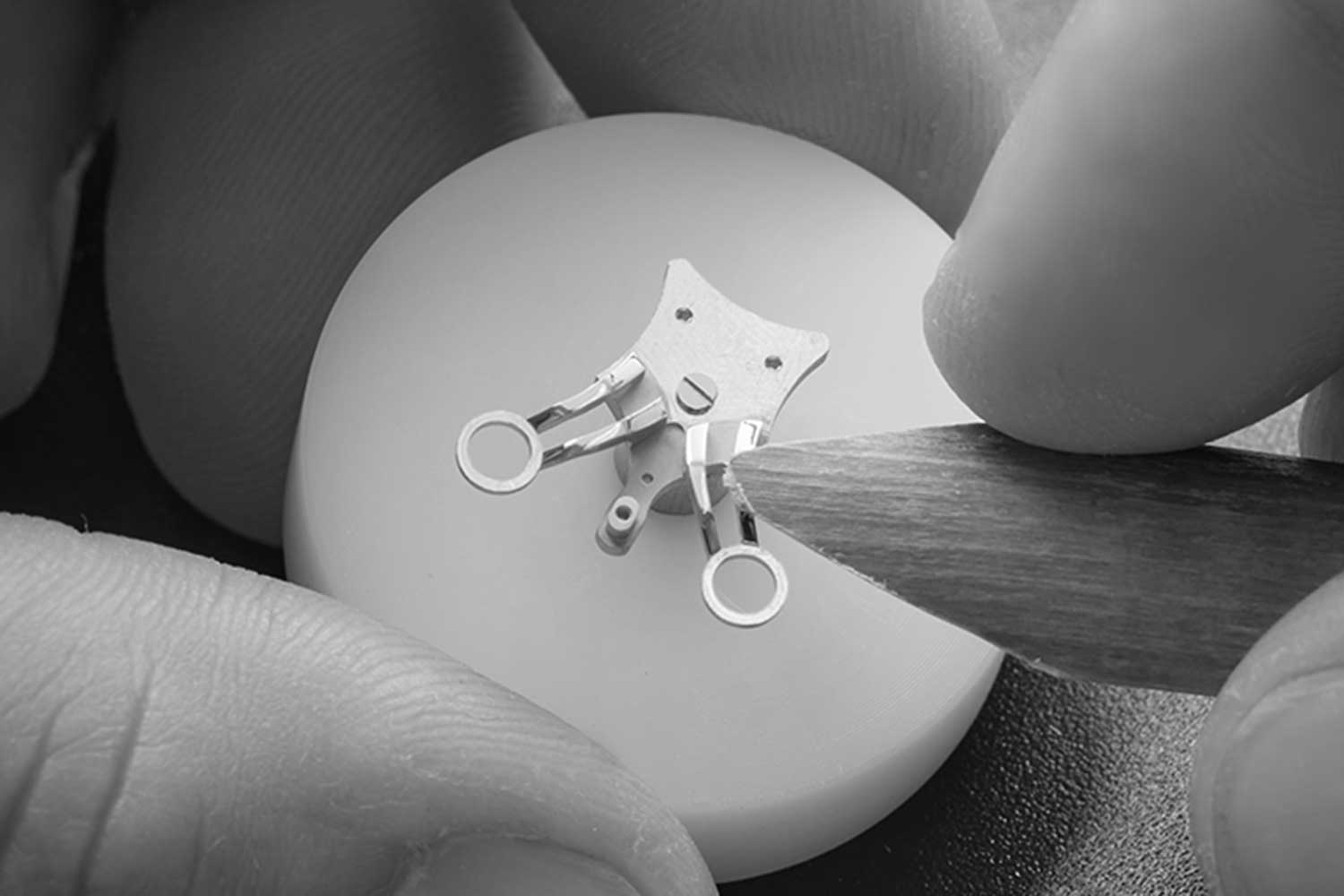 While other modern resonance watches, such as those by Beat Haldimann and Vianney Halter, placed twin balances in a shared tourbillon cage and linked the outer terminals of the hairsprings for coupling, Armin Strom’s solution was a compliant spring bridge. Not a bridge in the conventional sense supporting a wheel or gear, it is a flexible carbon steel element anchored at both ends to a holding bracket on the balance bridge. The hairspring studs are not fixed, as in traditional watches, but suspended along the spring bridge that spans both balances. A spring clip at the center of the bridge allows the structure to pivot and stretch as it flexes outward during oscillation. This ensures that tension remains consistent throughout the cycle by compensating for the slight change in length.