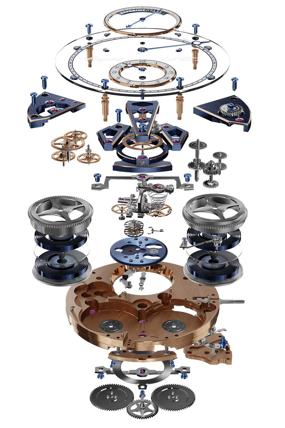 An exploded view of the Expérimentale 1 reveals the complex layering of the magnetic escapement, tourbillon carriage, and dual mainspring barrels
