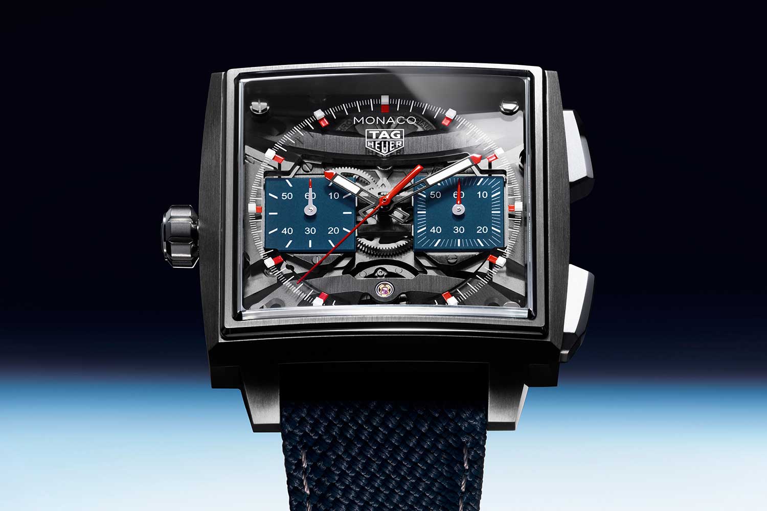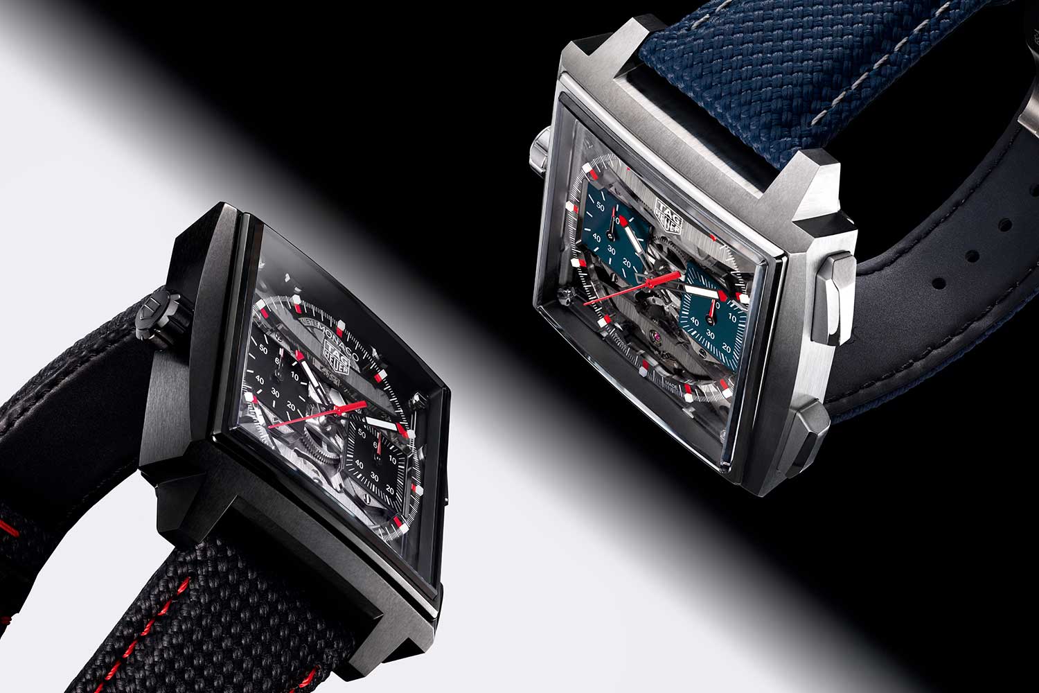 There are two executions of the TAG Heuer Monaco Evergraph, both in 40mm: in titanium with blue accents referencing the iconic Ref 1133, and a stealthy black DLC-coated titanium version, complete with black DLC-coated bridges and bold red accents that channels TAG Heuer’s racing DNA.
