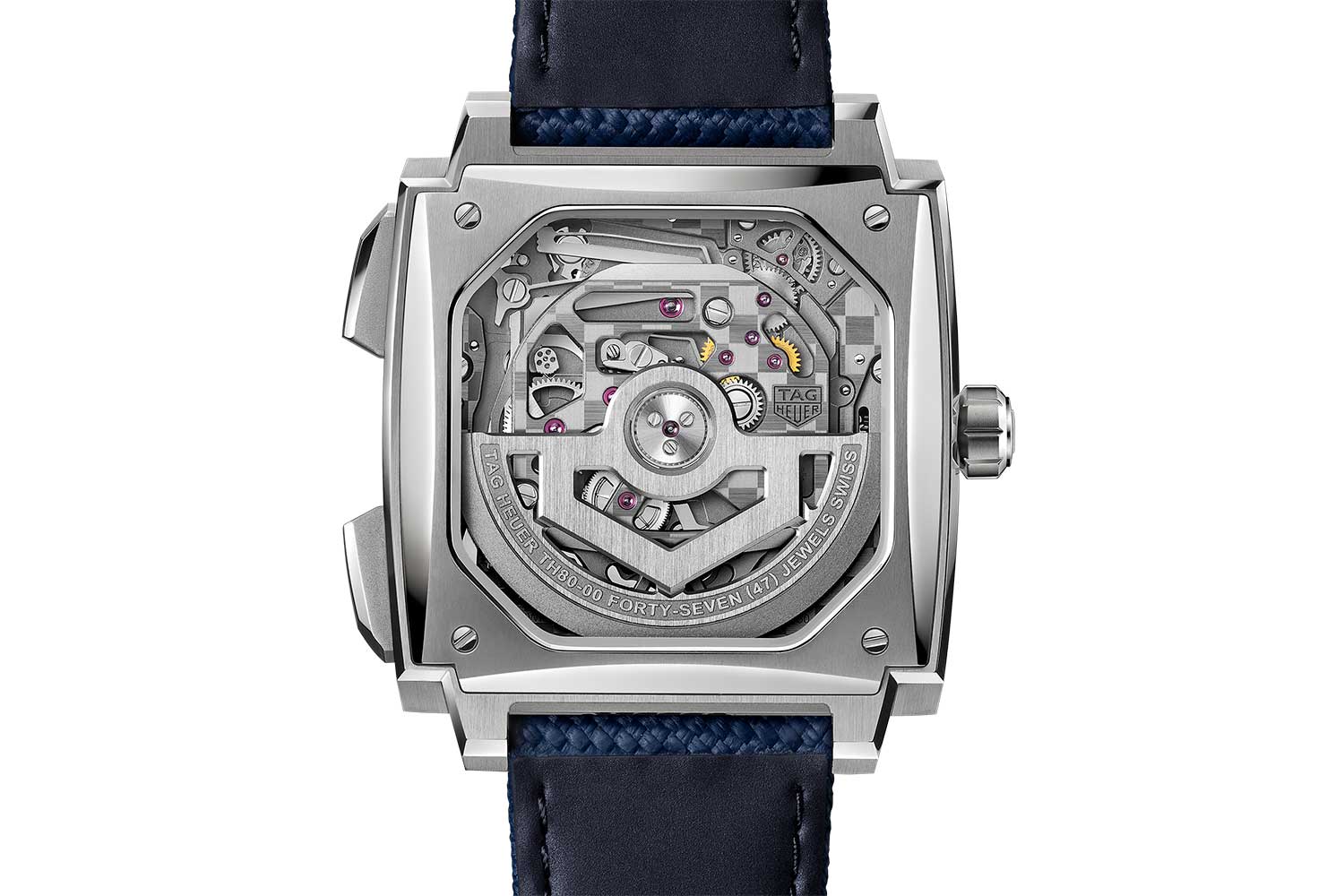 The movement bears an inverted construction, which means that the barrel, gear train and TH-Carbonspring balance and escapement are clearly visible on the transparent acrylic glass dial-side of the TAG Heuer Monaco Evergraph. Two fine-brushed, sandblasted bridges hold the barrel and escapement in place at 12 o’clock and 6 o’clock respectively, referencing their split-seconds counterparts in the Calibre TH81-00 at 9 o’clock and 3 o’clock. They also make up a visual symmetry that’s enhanced by the two subdials at 3 and 9 o’clock.