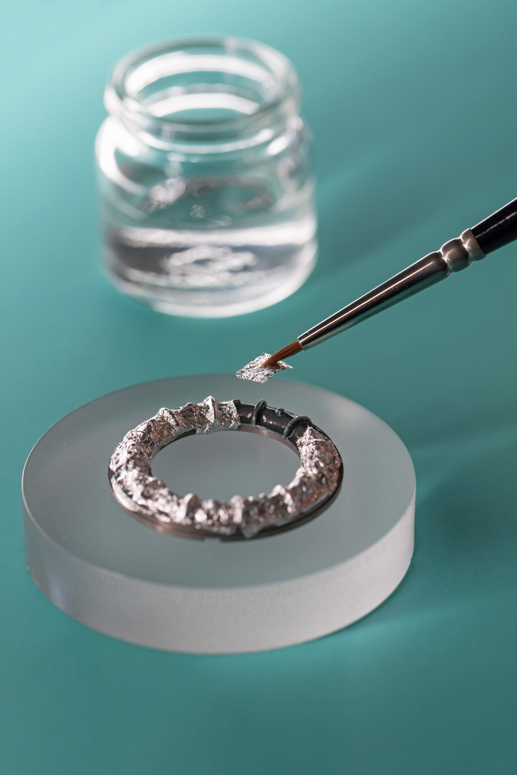The paillonné technique begins with hand-cut silver leaf, laid beneath the enamel to create the shimmering depth Schlumberger revived in the 1960s