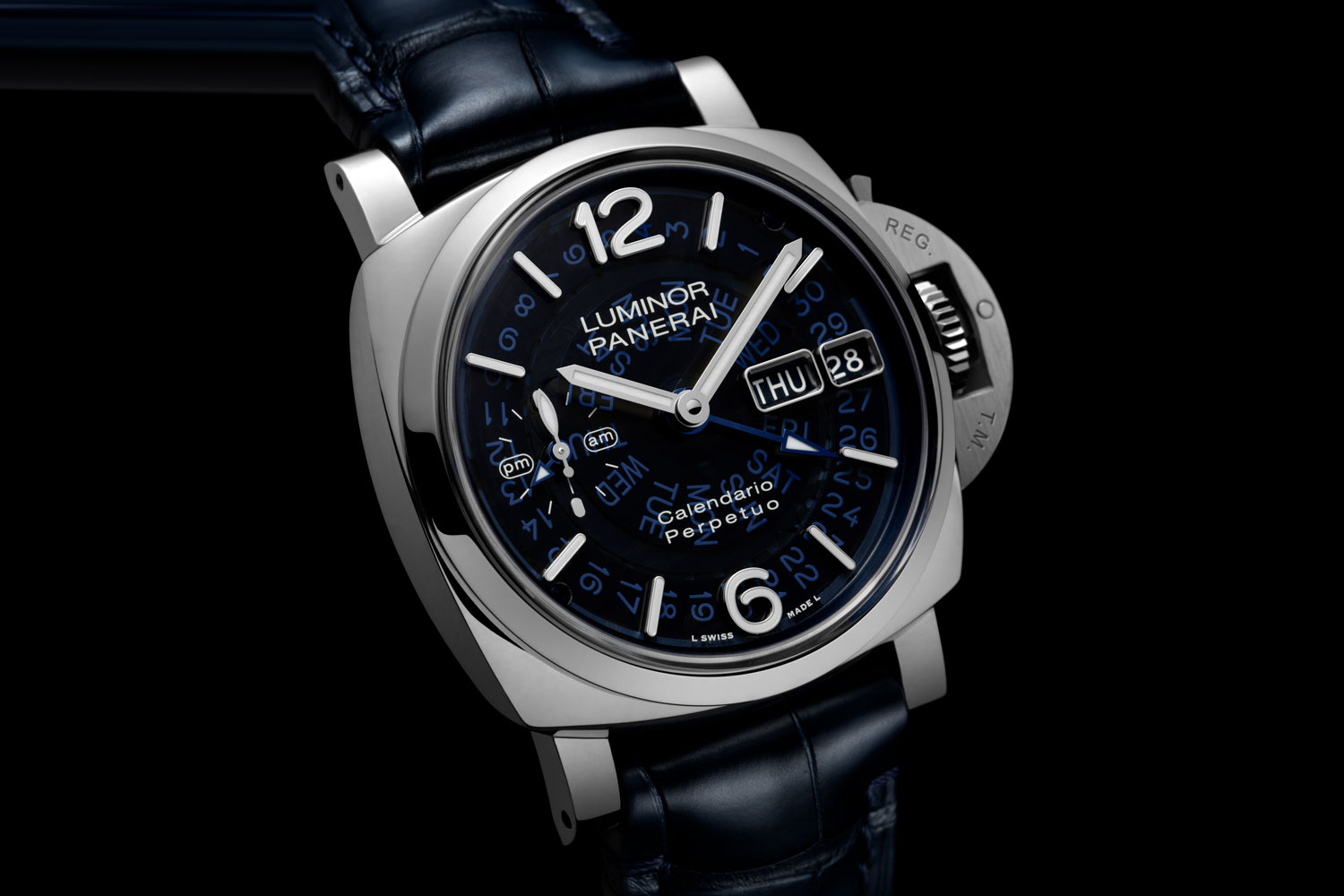 What sets it apart is the layout. Instead of the usual cluttered subdials, the Panerai features an in-line day and date display on the front, with the month and leap year indicators neatly tucked onto the caseback — all adjustable via a single crown. There’s also a subtle 12-hour GMT hand that hides beneath the main hour hand when not in use, and a day-night indicator integrated into the small seconds subdial. It’s a smart, user-friendly setup that preserves Panerai’s minimalist aesthetic while offering far better readability than most traditional perpetual calendars.