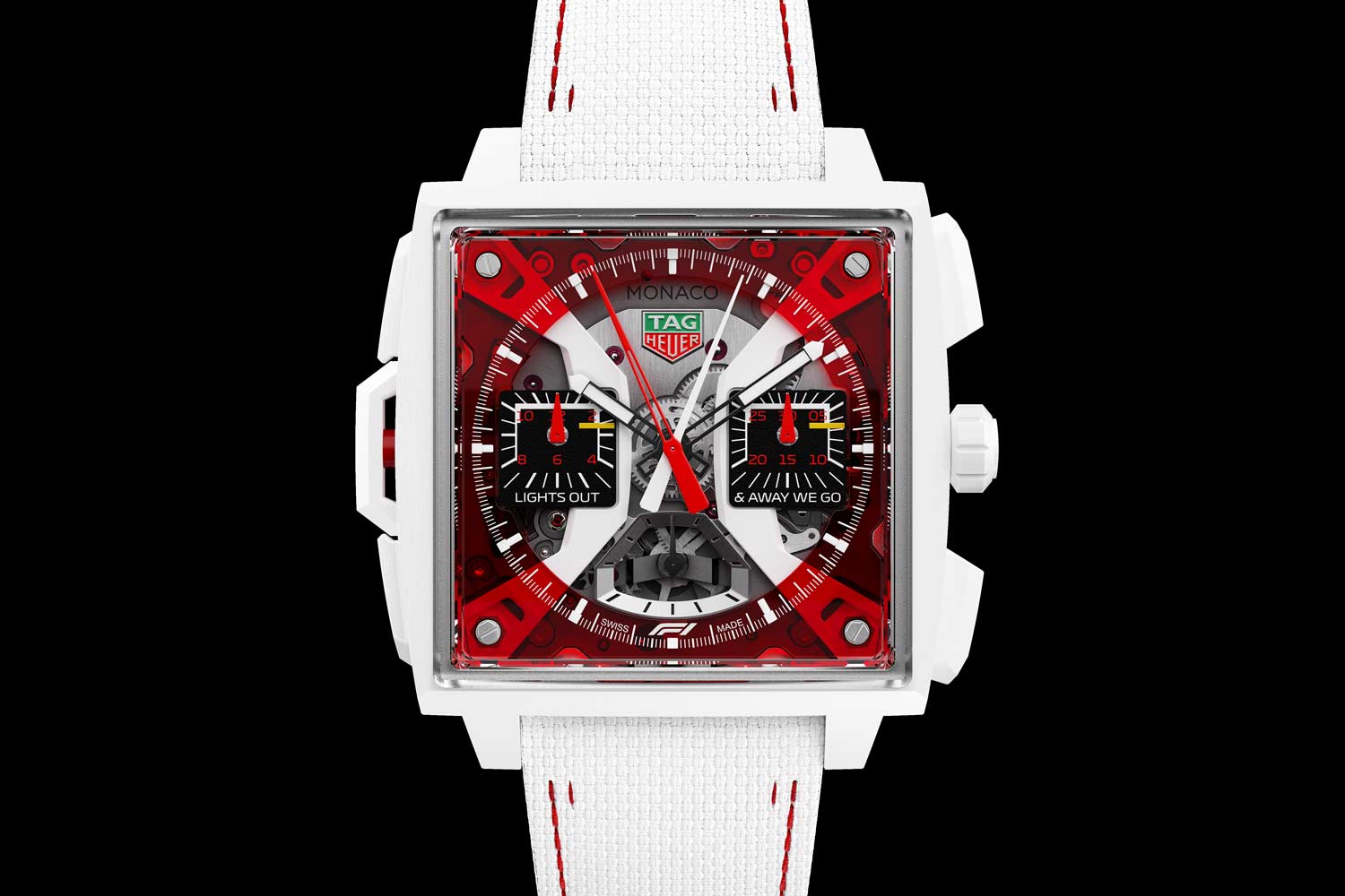 Another standout with coloured sapphire is the TAG Heuer Monaco Split-Seconds Chronograph F1, one of the brand’s flagship models, developed under the guidance of Movements Director Carole Forrestier-Kasapi, who was also the original inventor of the Ulysse Nardin Freak mechanism. In this latest edition, TAG Heuer boldly combines white ceramic with a red sapphire dial, creating a clean, striking look that’s sporty yet sophisticated. It’s a nod to the vibrant, bold colours TAG Heuer embraced in the 1970s, but now reimagined with the materials and technology of today’s era.