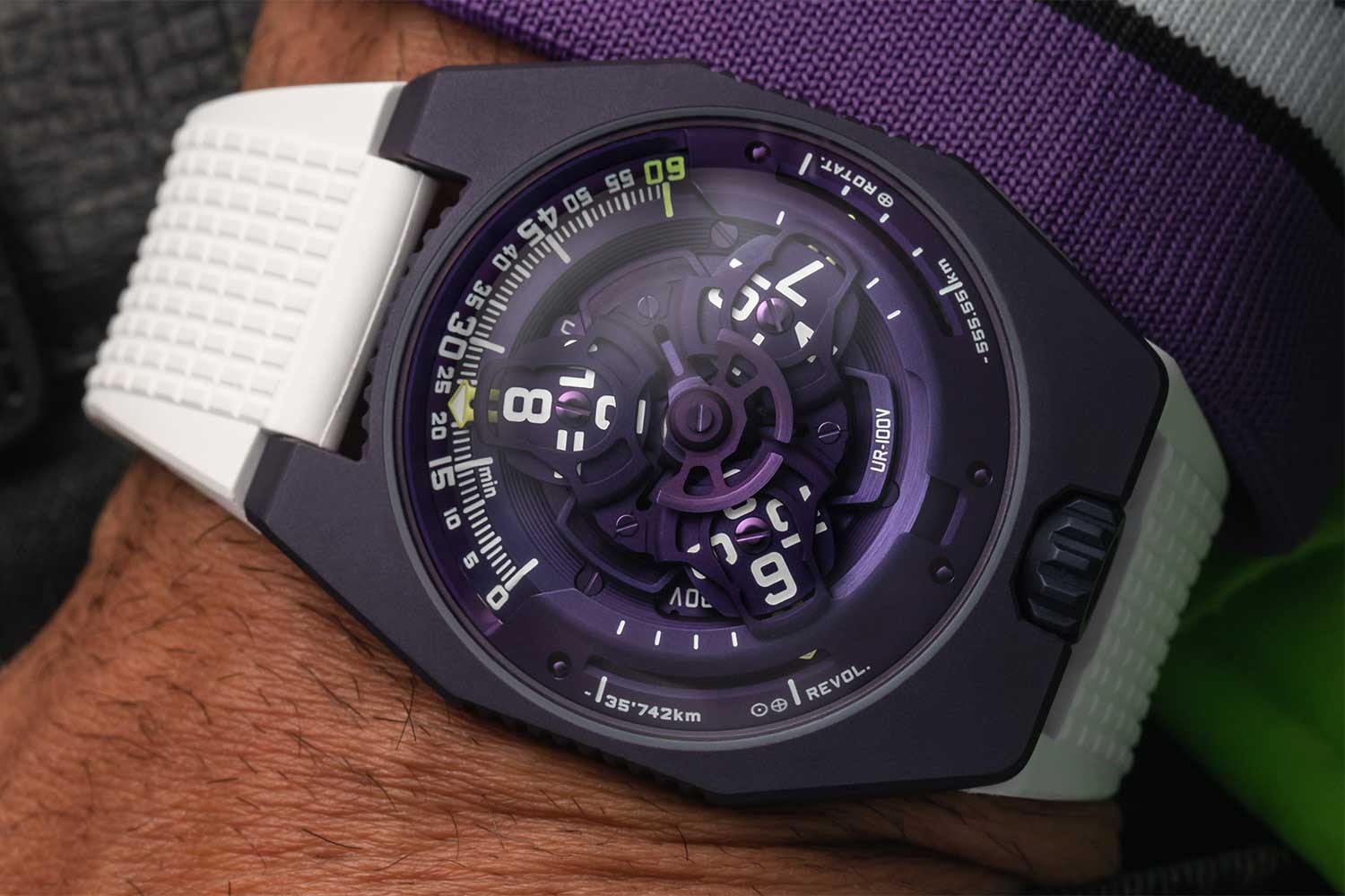 URWERK treads a hard enough path — mechanically, aesthetically — that few dare to follow. Its carousel of satellite hours and minutes is not only a thing of beauty, the company largely owns this mode of time display, with nary a rival contestant in sight. Yet over the years, URWERK has also introduced new ideas and executions centred around the same idea to keep things fresh, with the proverbial finger on the pulse of contemporary culture. Arguably its cheeriest yet, is the delightfully playful and purple UR-100V.