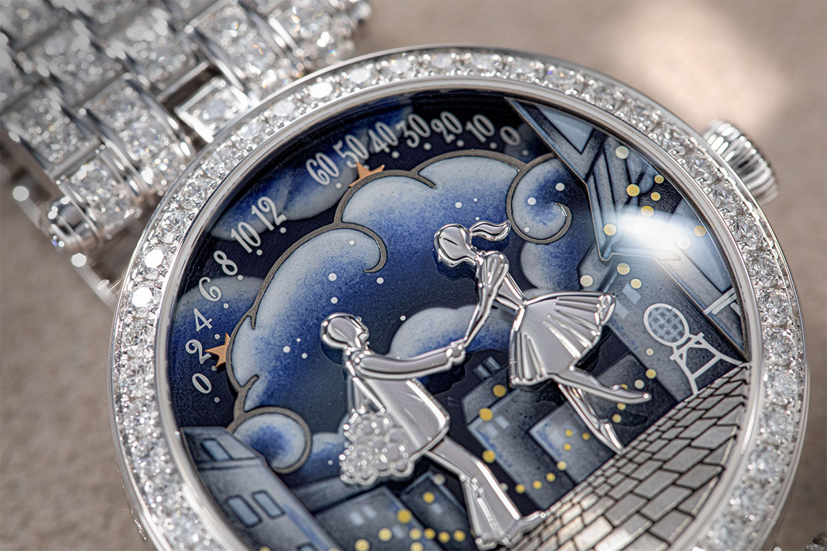 So, how does this new scene translate into a watch? From a design point of view, it hews closely to the overall Lady Arpels design — in this instance, a 38mm case with a T-bar lug, all amply set with diamonds. The real magic happens on the dial. On the Pont des Amoureux models, the couple themselves served as time markers, but here, the pair are relieved of such duties, able to focus solely on each other. Instead, there are two golden stars peeking out from behind the dark clouds, realised in grisaille enamel, which mark the hours and the minutes.