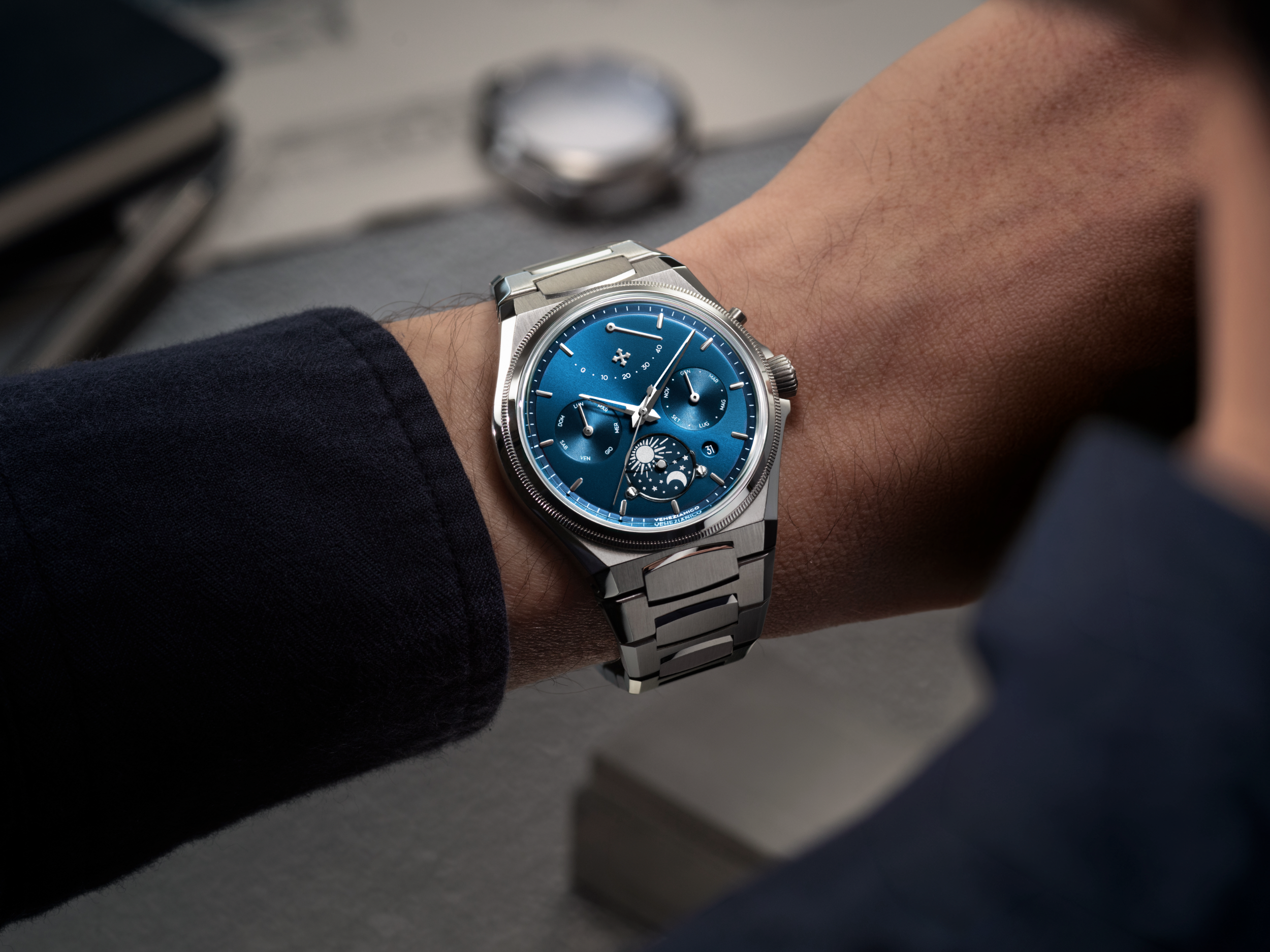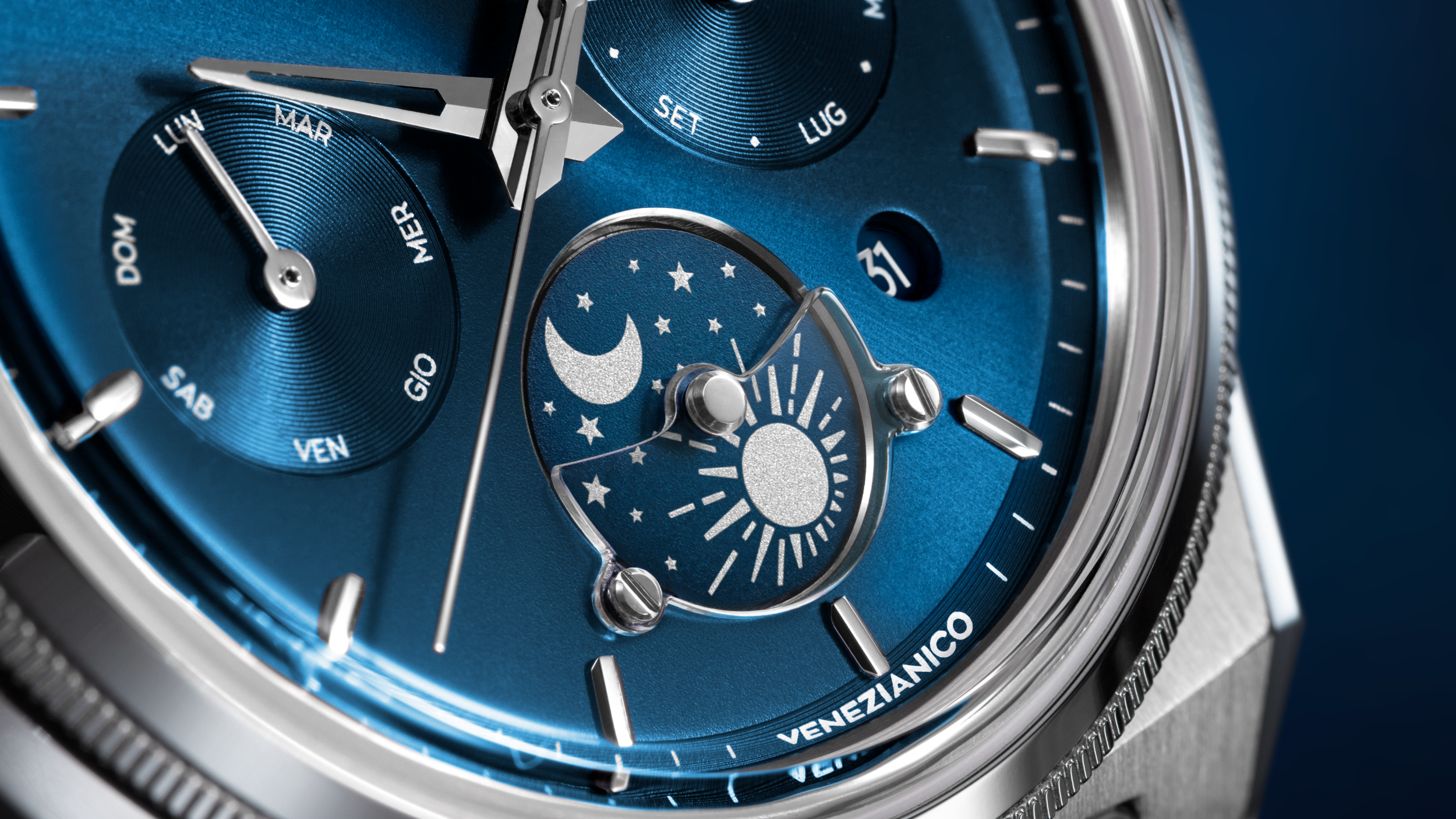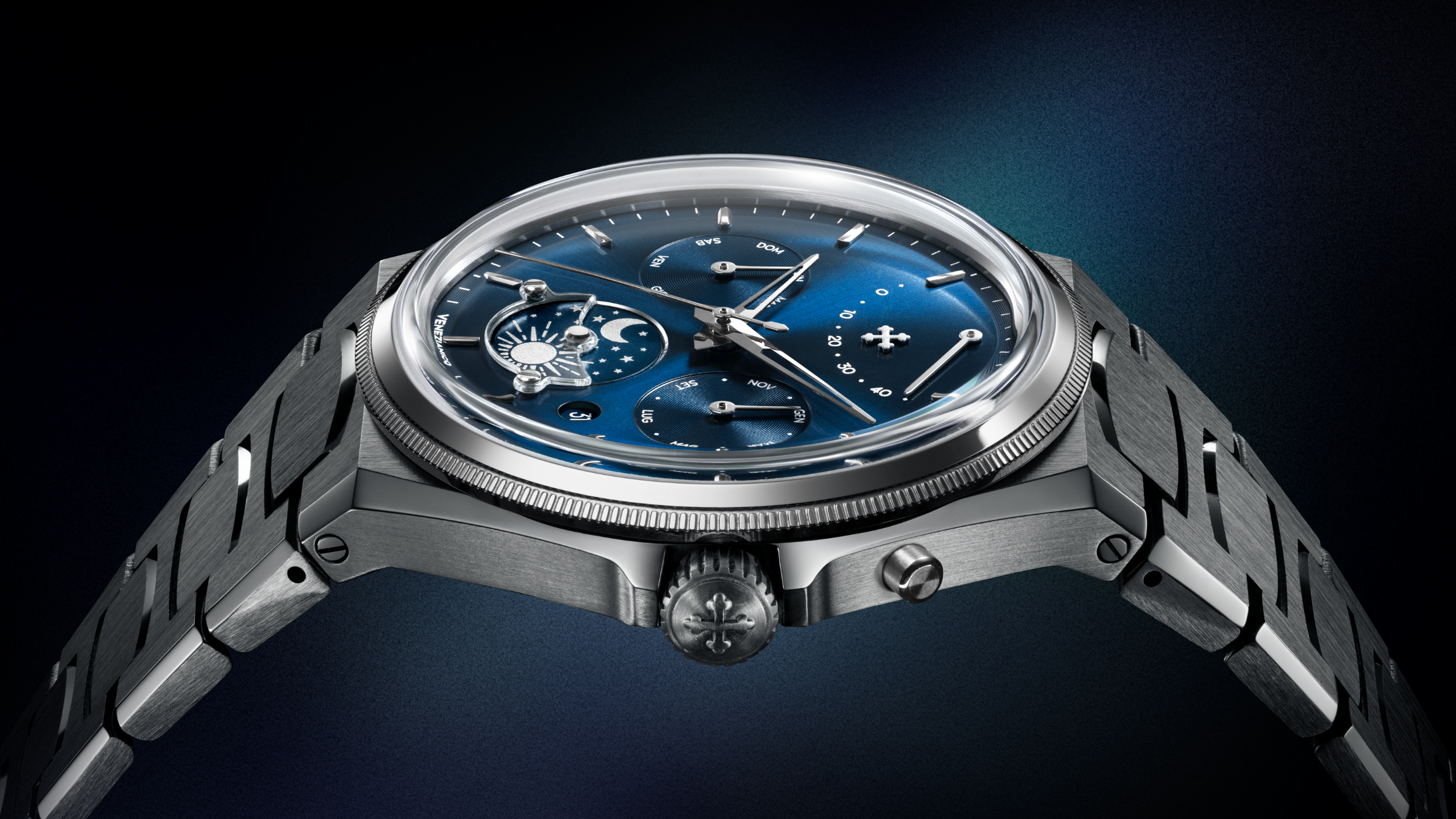 The Arsenale Calendario’s main point of interest, though, is how it arranges information across the dial. Various indications are designed and organized to feel orderly and visually coherent, drawing on the logic that Venezianico affiliates with the Arsenale di Venezia: modularity, sequence and control.