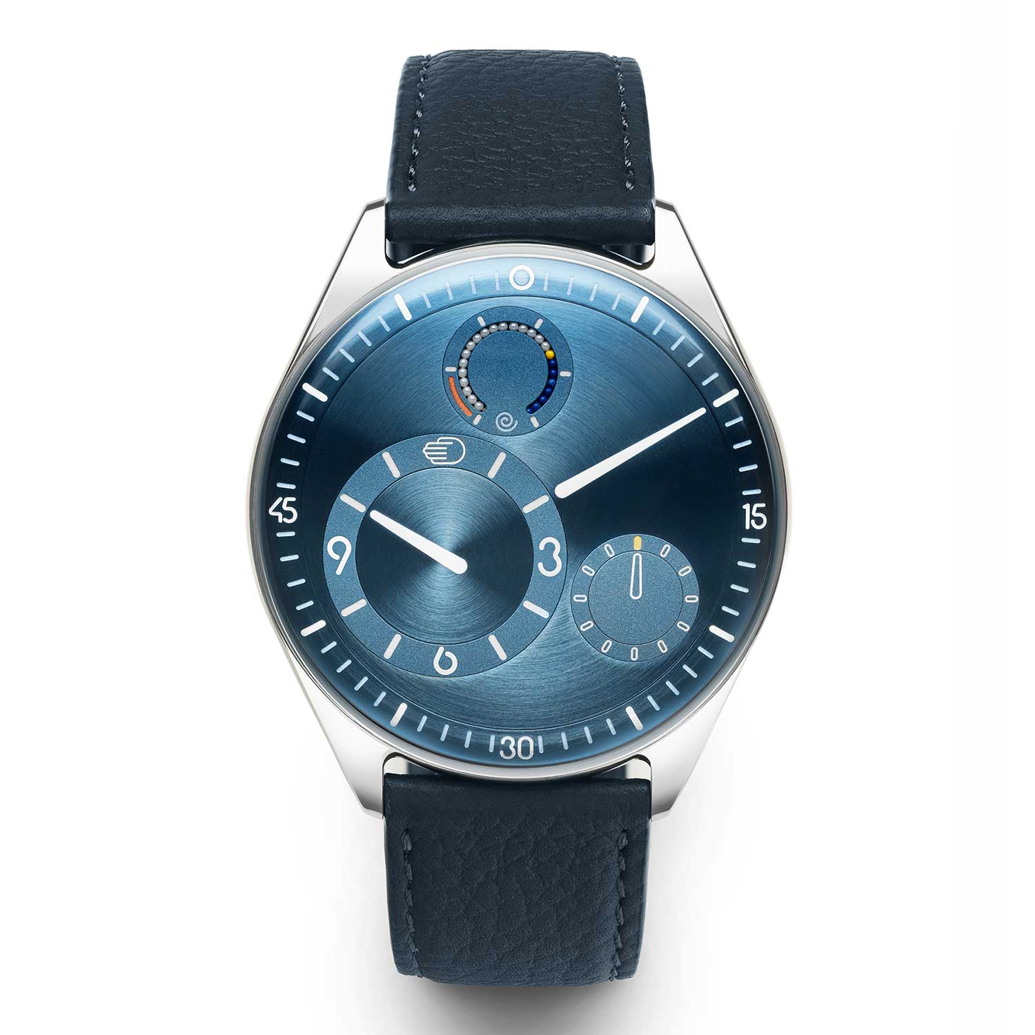 The signature ROCS rotating discs display hours, minutes, power reserve, and seconds without hands, crown, or conventional indices