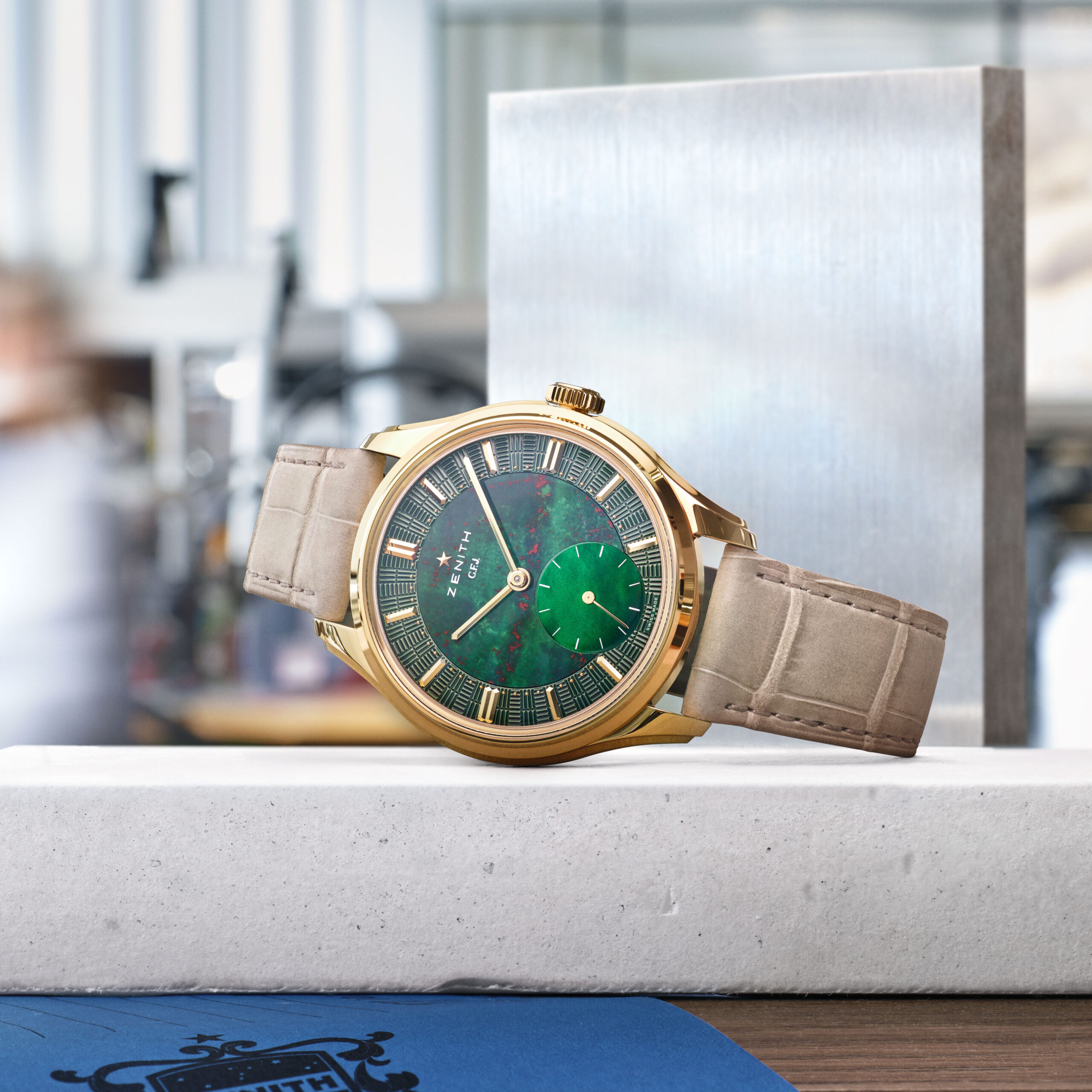 Zenith G.F.J. Yellow Gold Bloodstone, where the Calibre 135 returns in a more expressive form, pairing chronometric precision with a richly textured stone dial