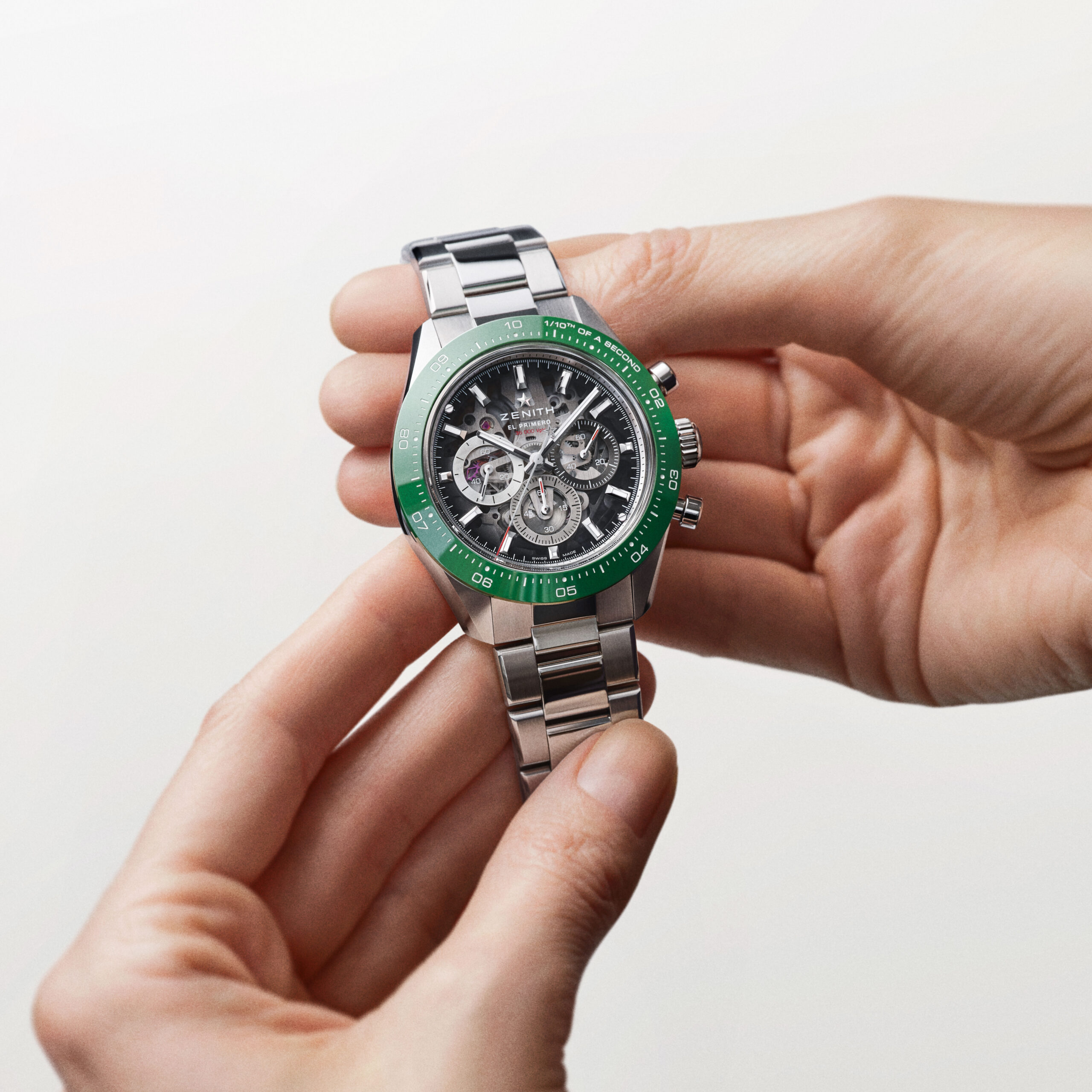 - Zenith Chronomaster Sport in steel with green ceramic bezel and bracelet